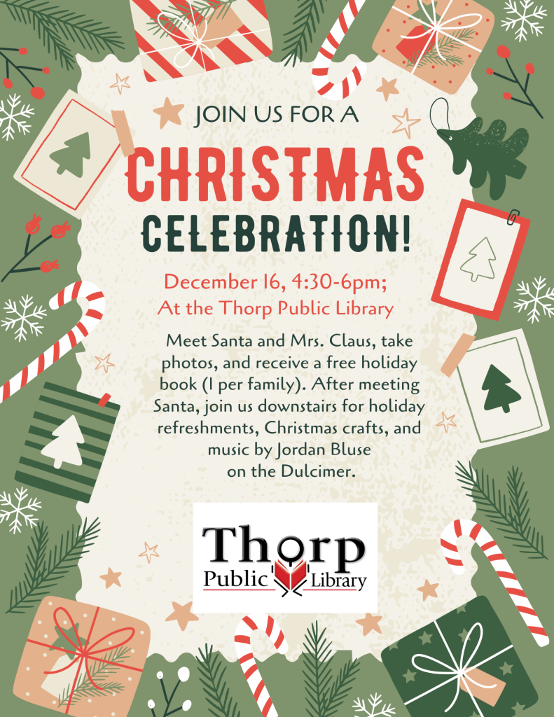 Tuesday 12/16: Visit with Santa and Mrs. Claus from 4:30- 6:00. Children can make an ornament, and a small snack will be available for everyone! We will also have live music and free books (One book per Family) Don’t forget your camera!